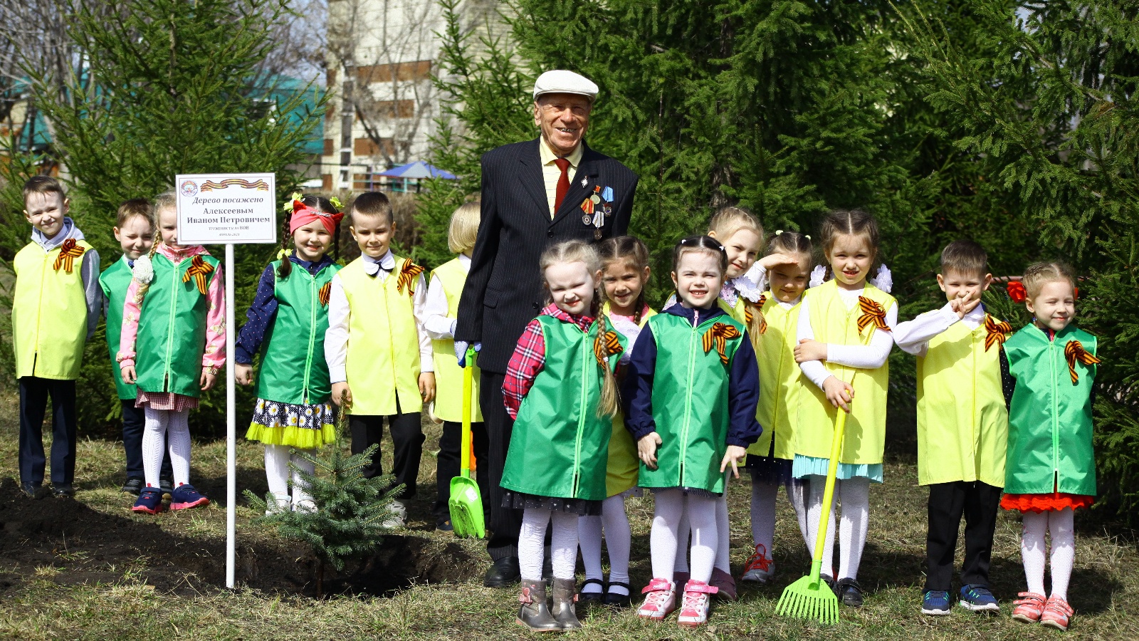 Также дошкольники поддержали акцию «Сад памяти». Вместе с почетным гостем – тружеником тыла Иваном Петровичем Алексеевым они посадили саженцы голубой ели на территории дошкольного учреждения. Ветеран ВОВ поблагодарил воспитанников детского сада за теплый прием и пожелал всем мирного неба над головой.