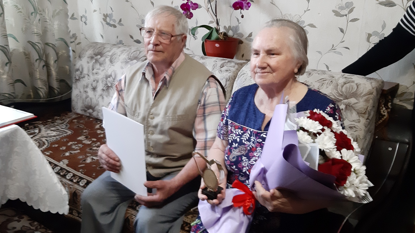 С торжественным событием юбиляров поздравили специалисты отдела ЗАГС и представители общественной организации «Женсовет» Бугульминского района, они пожелали семье благополучия и дальнейшего процветания, вручили поздравительный адрес и цветы от Главы Бугульминского района, Линара Закирова, юбилейные свидетельство и медаль, а также сладкий.