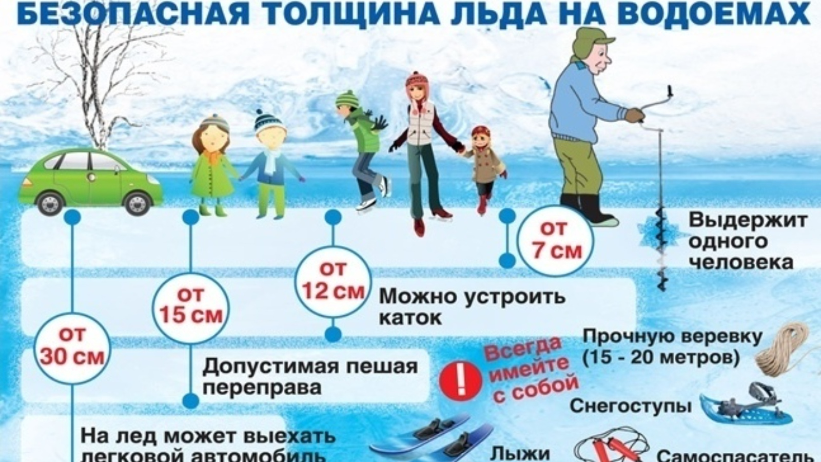 Для одиночных пешеходов, рыбаков лёд считается прочным при толщине не менее 7 сантиметров, для группы людей – 12 сантиметров. Наиболее прочен чистый, прозрачный лёд. На участках, запорошенных снегом, лёд, как правило, тонкий и не крепкий.
