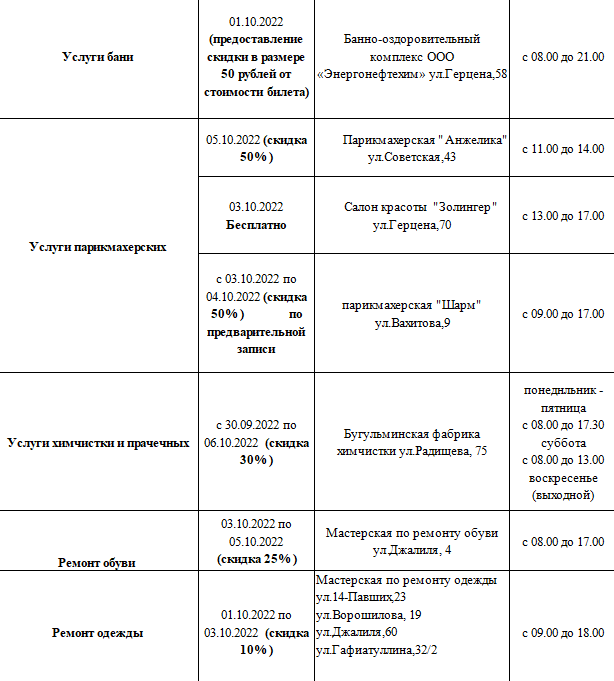 Бөгелмәдә һәм районда 1 октябрьдән 10 октябрьгә кадәр үтәчәк Өлкәннәр декадасы якынлаша. Декада кысаларында гадәттәгечә өлкәннәргә чәчтараш, мунча, химчистка һәм остаханәләрдә ташламалы бәяләр белән хезмәт күрсәтү чаралары оештырылачак.